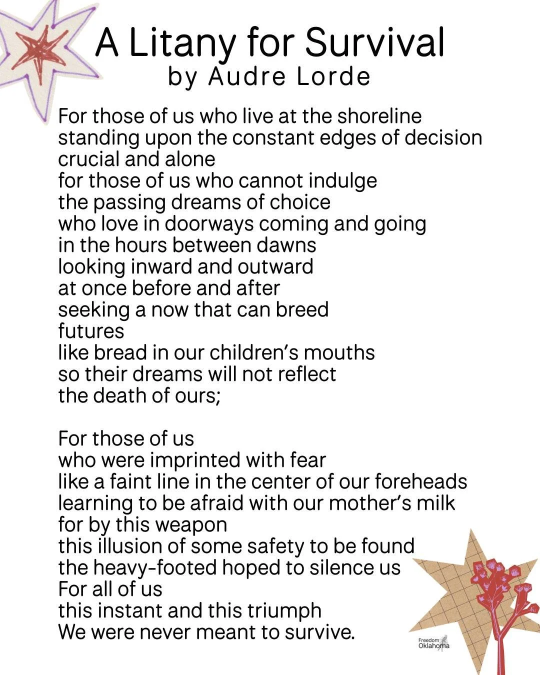 Freedom Oklahoma advocates and organizes across Oklahoma and among the 39 sovereign tribal nations to build a future where all Two Spirit, Lesbian, Gay, Bisexual, Transgender, Queer, and fuller spectrum of people whose sexuality or gender or romantic identity exists beyond a heteronormative, binary framework (2SLGBTQ+), have the safety, resources, and community to thrive, everywhere we call home.