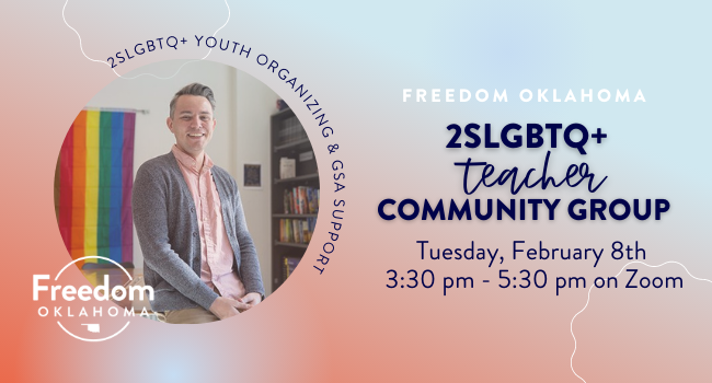 Image description: A teacher leaning against a desk wearing a grey cardigan, pink shirt, and smiling. A rainbow Pride flag is on the wall of their classroom. Outside the image are the Freedom Oklahoma logo and blue text: “2SLGBTQ+ Youth Organizing & GSA Support.” An orange and light blue color gradient with 2 white squiggly lines is the background. To the right is blue & white text: “Freedom Oklahoma | 2SLGBTQ+ Teacher Community Group | Tuesday, February 8th | 3:30 - 5:30 pm on Zoom