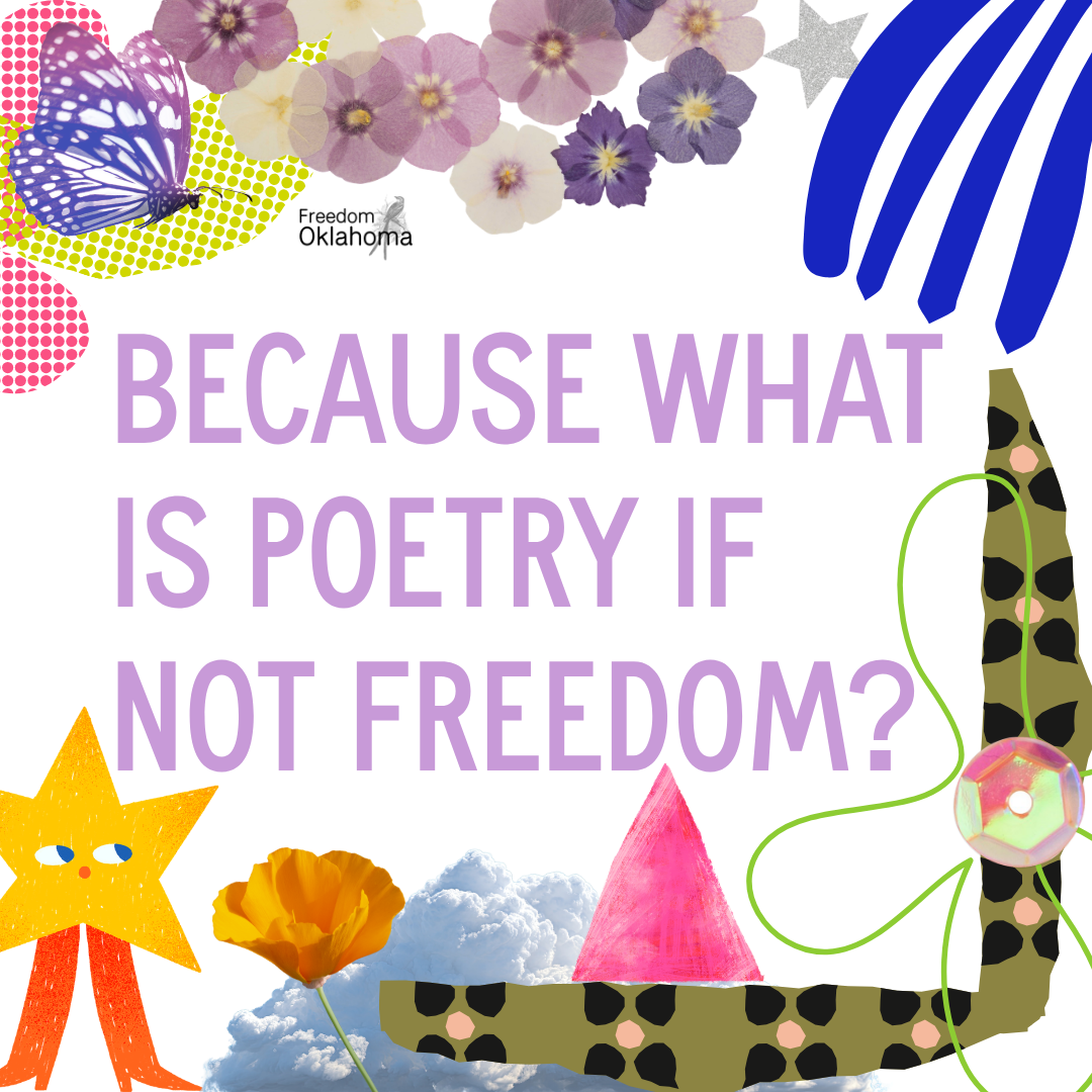ID: digital collage with floral and doodled elements and text "Because what is poetry if not freedom?"