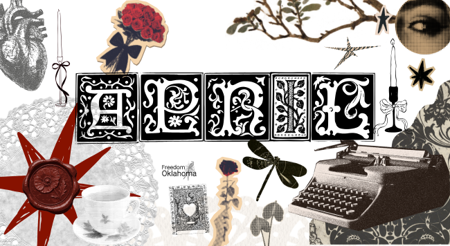 ID: digital collage with poetry elements including typewriter and candles and text "April" with a freedom oklahoma logo.