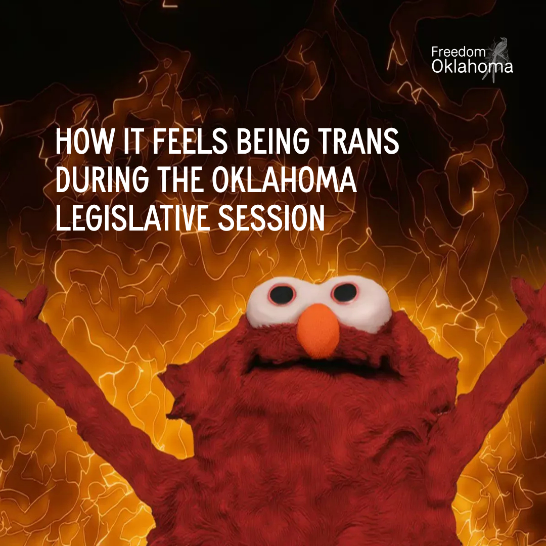 ID: Hellmo (a meme-d version of Elmo with fire behind him) and text "How it feels being trans during the Oklahoma Legislative session".