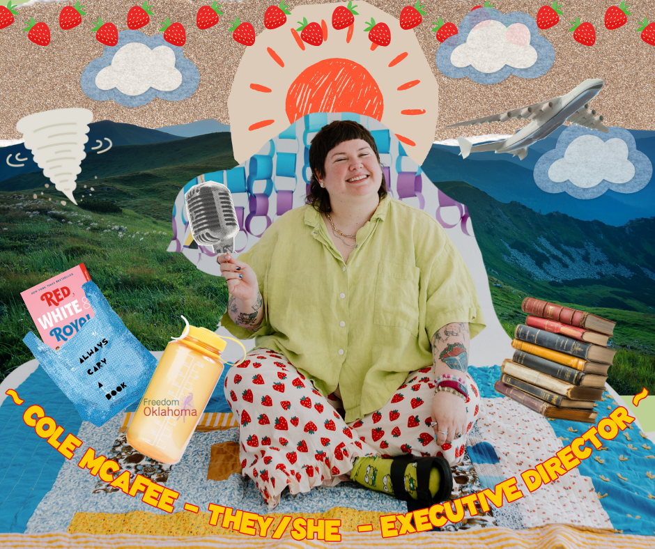 ID: On a collage of scrap paper, there is a cutout of Cole, from a photo shoot with Alexandrea Delgato 2025. There is a sun behind Cole who is sitting on a blanket holding a microphone and surround by things you will fine them with routinely - like a water bottle, tote bag, stack of books, and a very good outfit. November Programming With Freedom Oklahoma