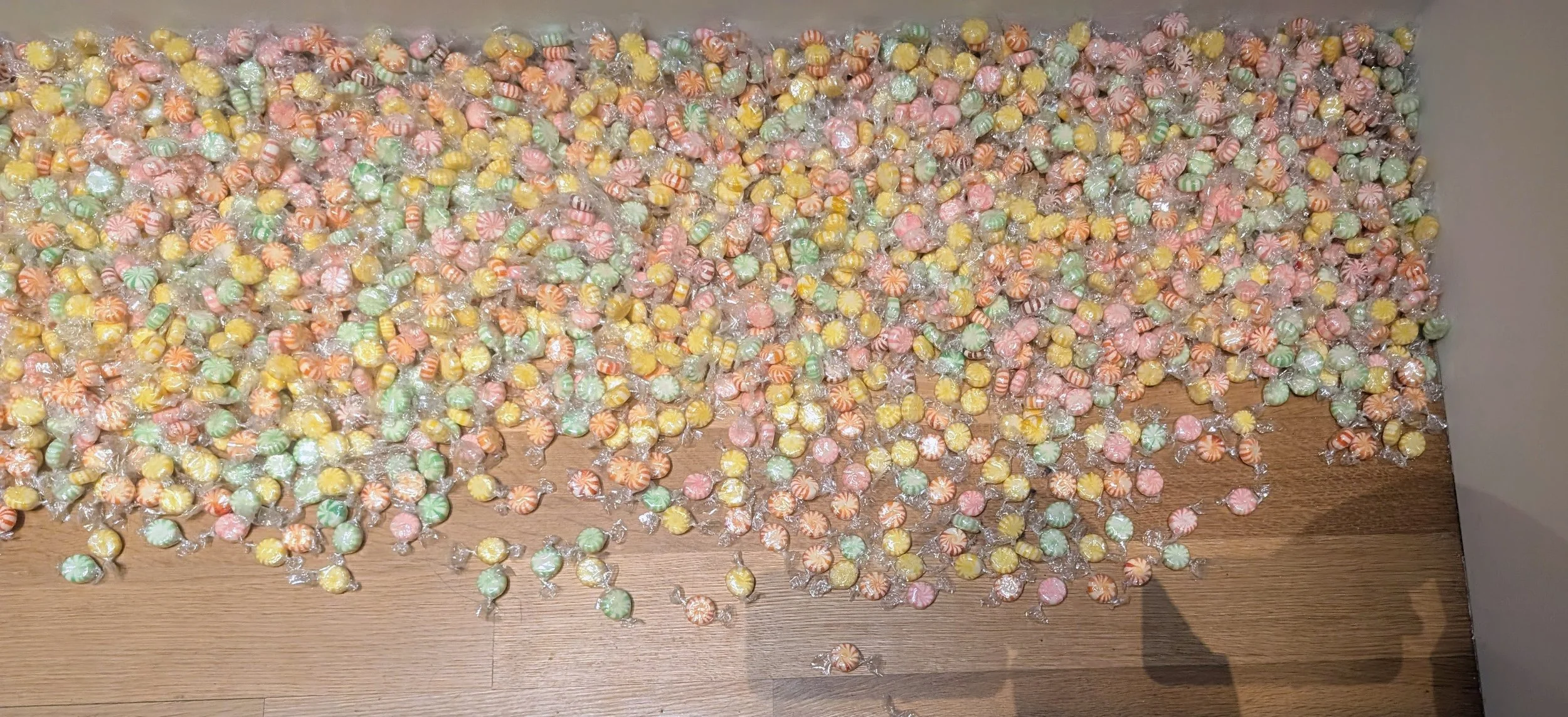 Photo of Felix González-Torres "Untitled" (Portrait of Ross in L.A.) on display at the Smithsonian National Portrait Gallery spring 2025 taken by Cole McAfee. ID: red, green, and yellow wrapped candies in a scattered pile along the floor.