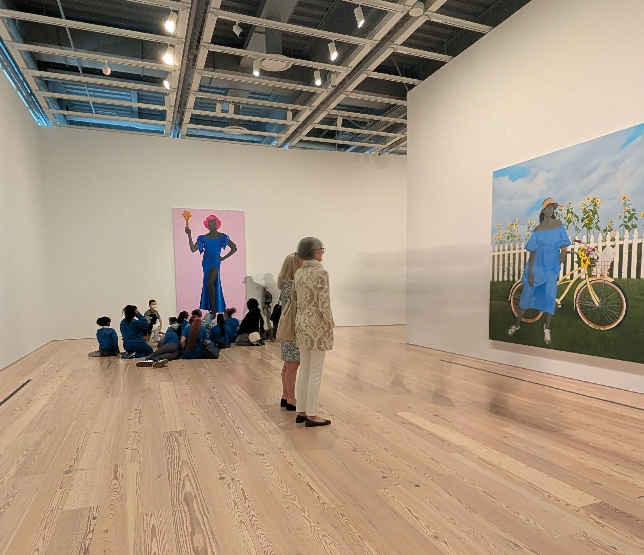 Amy Sherald, Trans Forming Liberty, 2024, on display at the Whitney 2025, photo by Cole McAfee (admission to the Whitney $30). ID: a group of school children sits on the floor in front of a portrait of a Black, trans woman as the Statue of Liberty in a blue dress on a pink background, in the foreground two people look at another Amy Sherald piece, with long exposure showing another person walking by in the space.