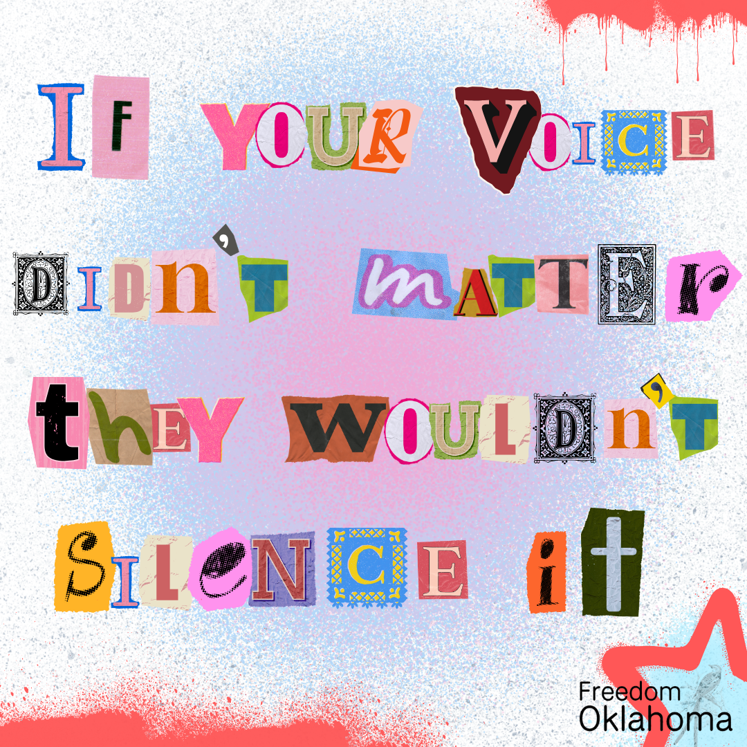 ID: Digital collage with text “If your voice didn’t matter they wouldn’t silence it.” Airbrush and spray paint elements in various shades of pink and purple. The Freedom Oklahoma logo is in the bottom left corner.